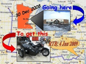 My plan seemed simple enough. Get north, sign papers, ride south. Don filled in the blanks. Train to Chicago; rental car to St. Cloud, hotel accommodations, etc, etc. Don would also fill the sidecar and he didn’t even complain about being called "ballast."