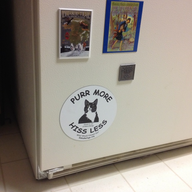 It turns out that the big picture was influenced by a very little picture; a “sticker” as the tall new-staff referred to it. Tall new-staff put the sticker where Holly would be certain to see it even with her aging eyes. “Hiss less; Purr more” was the phrase.