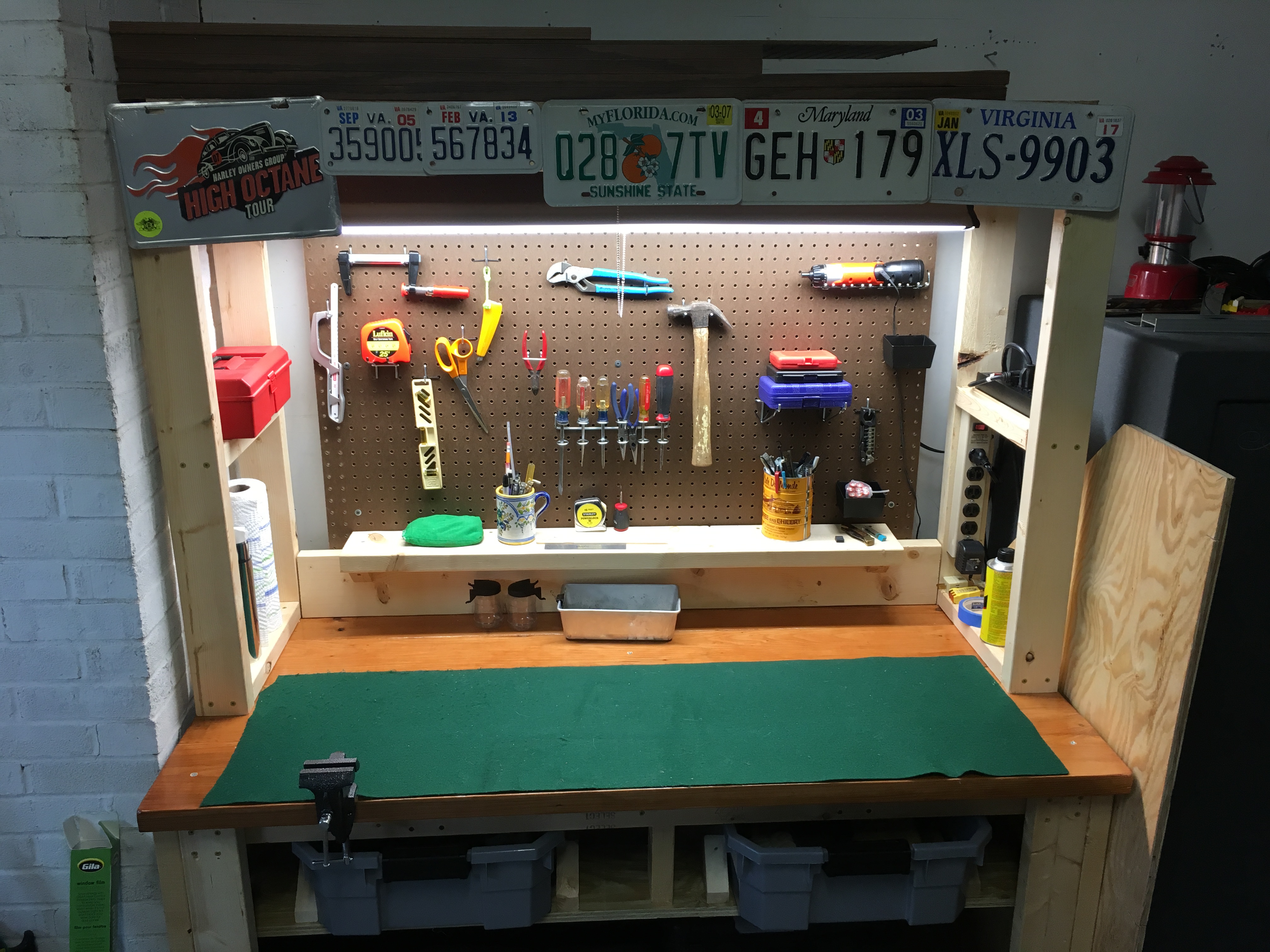 I wasted no time getting the tools sorted and positioned for use. The drawers are simple utility bins but well positioned. There is a mechanical stop which allows full access to the bin without concern over falling from its shelf. The back is pegboard and under the top shelf is a bright work lamp. It is an outstanding piece of furniture and he’s probably tired of me texting him every time I use it.