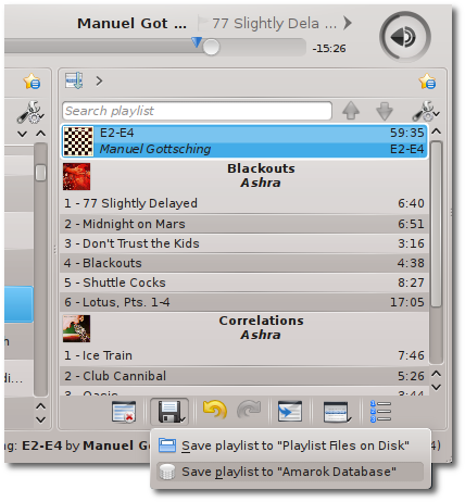 Conversely, maybe you create a playlist that you love and want to save forever; in that case, hit the little floppy disk icon instead and you can save the list. You have two choices here; save to Disk or save to Database. If you are one of those mix-tape type people and you want the playlist preserved in an easy-to-access format that you will always be able to get to even if you lose track of that install of Amarok, then save to disk. I just save it to the Amarok database.