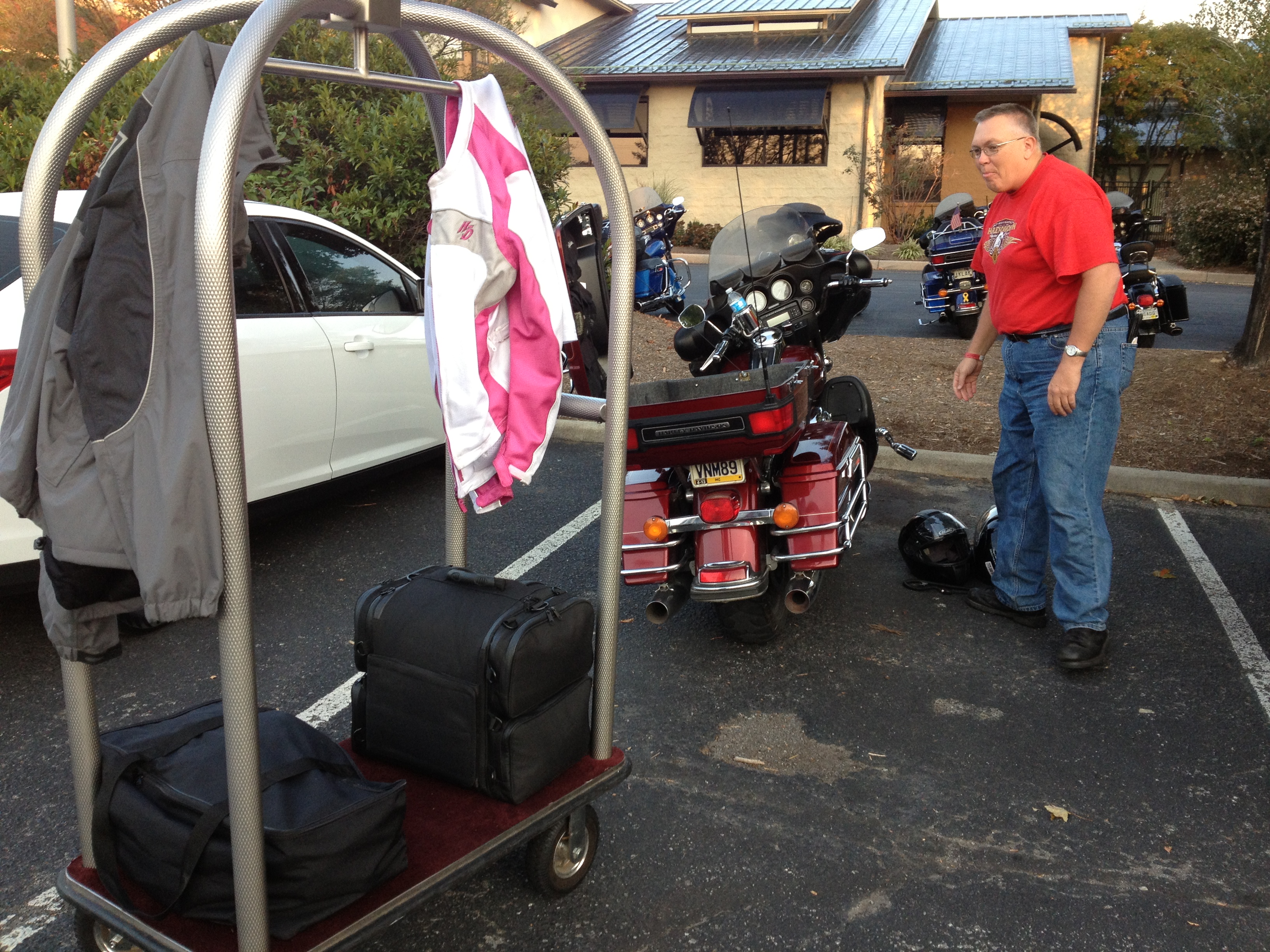 My packing and unpacking the motorcycle consisted of the clothes I was wearing, a helmet, and one (count ’em folks – one) bag. And it was a small bag. But, hey, I’m not pointing fingers. I’m just saying that everybody was pleased to be in one hotel for more than one night. With no bags strapped to the bike, it would handle much better in the turns. And we had some serious turns coming up — U.S. Route 129, also known as “The Tail of the Dragon.”