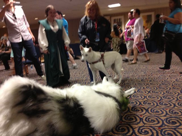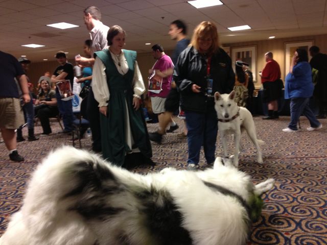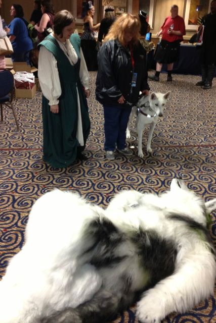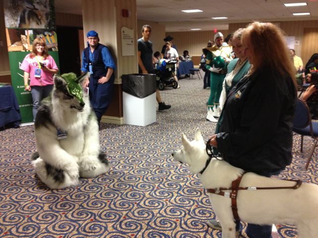 So while my friend Cherie and her guide dog are transiting a large open area in one of the host hotels, a man in wolf suit (looking like a rather large but believable wolf) appears as he too makes his way through the crowd. Here are the photos of what happened next.