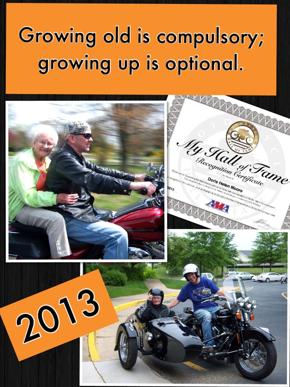 On Mother’s Day 2013, she became an honorary inductee to the American Motorcycle Association (AMA) Hall of Fame. For 365 days, a picture of her riding on the back of the red Harley-Davidson motorcycle will hang in the entry way of the AMA Hall of Fame and Museum.