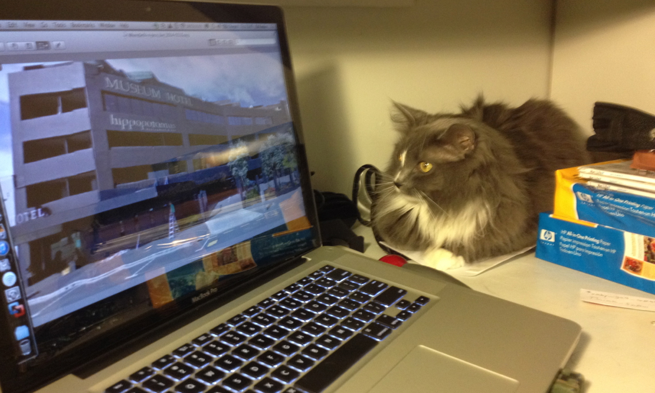 The other night I was strolling about and the other cat jumped off of the new-staffer’s bed, rushed to the top of the wooden hill and had a genuine hissy-fit. She carried on for a bit and then ran down the wooden hill to the area known as downstairs. Mind you I had not made a move while the other cat was making this loud show of “I’m number one. I’m number one.” Sure, sure, you’re number one. Now can we get on with the important stuff? Like where does the red dot hide when tall new-staff is away?
